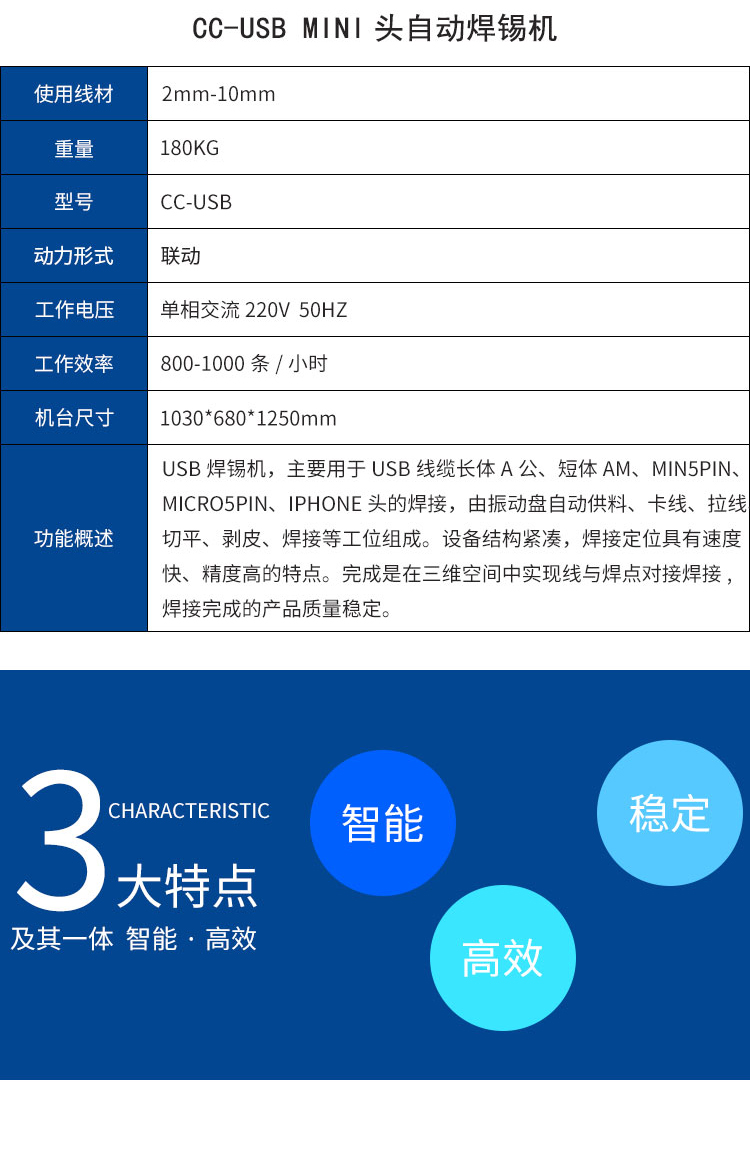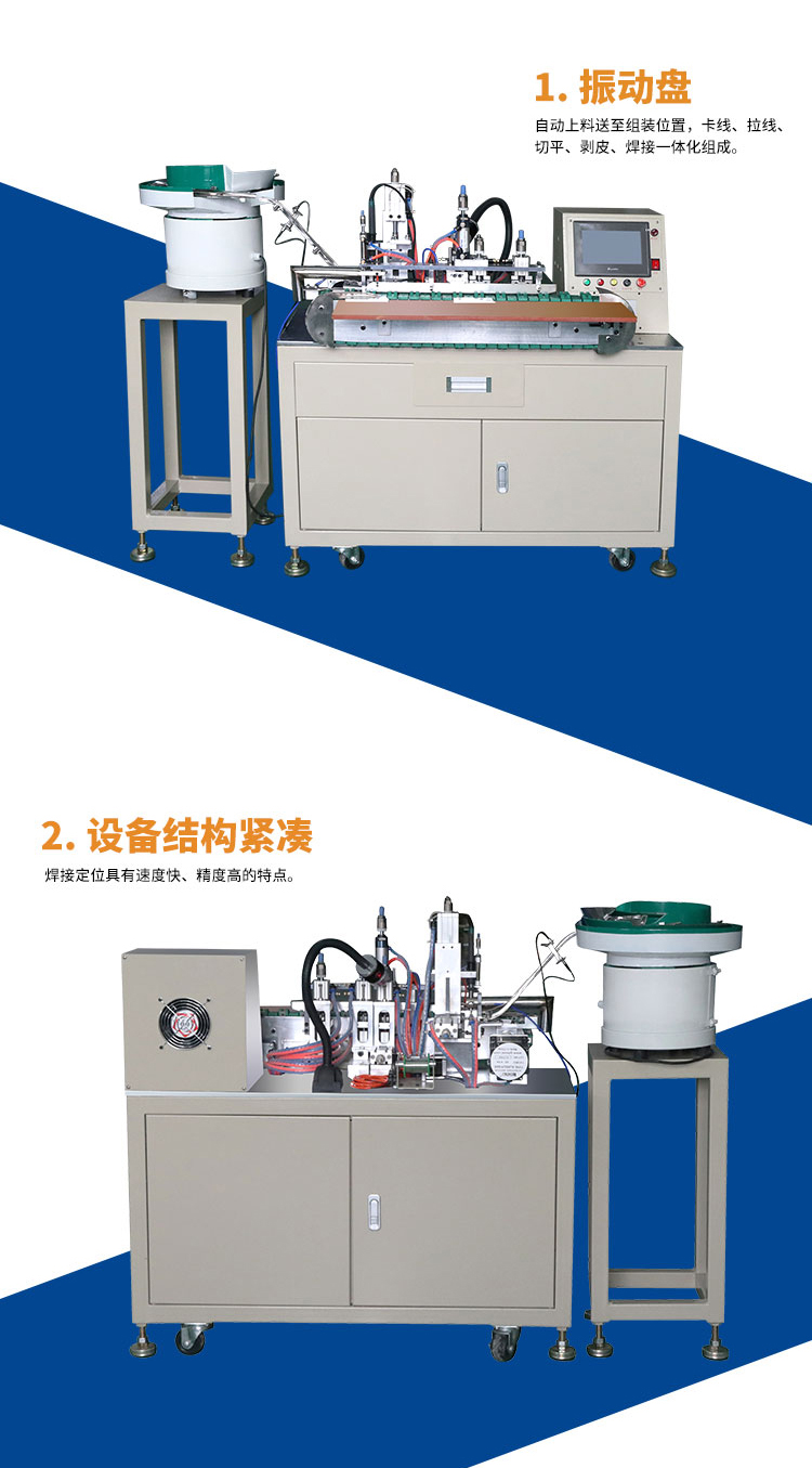 USB自動焊錫機,主要用于USB線纜長體A公、短體AM、MINI5PIN、MICRO5PIN的焊接,由振動盤自動供料、再分線、拉線、切平、剝皮、